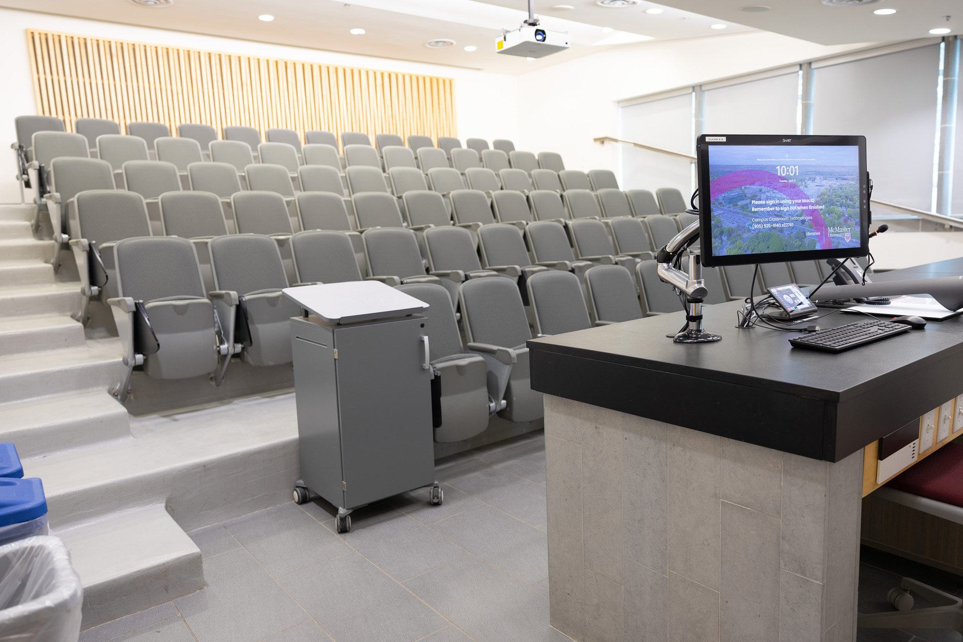BSB 108 is a fully equipped lecture theatre designed for presentations and technical sessions. The room features a projection system, built-in audio, and multiple connectivity options for laptops and devices. Seating consists of fixed tiered chairs with non-retractable tablet arms.